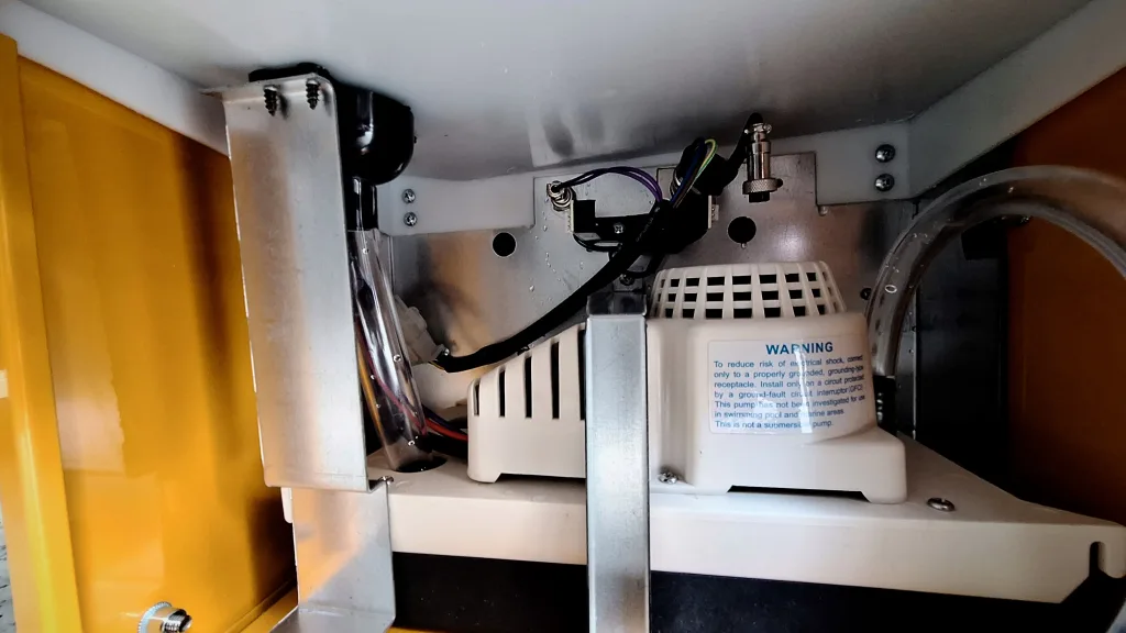 Υπάρχει επίσης διαθέσιμο το ίδιο μοντέλο με εσωτερική αντλία που απομακρύνει αυτόματα το νερό που έχει συσσωρευτεί και μπορεί να το ανεβάσει σε ύψος 4 μέτρων πιο ψηλά απο το επίπεδο που έχει τοποθετηθεί ο αφυγραντήρας (παρακάτω φωτογραφία).